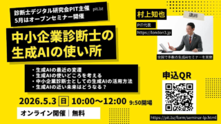 中小企業診断士のデジタル研究会PITは毎月第一日曜日10〜12時にオンラインで開催しています。普段は、参加メンバが最近のデジタルネタを発表・共有しています。各人のデジタルリテラシーの向上や、中小企業へのデジタル支援力の向上を目的としています...