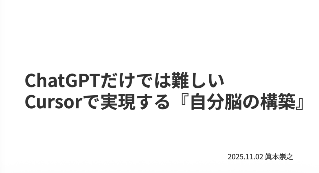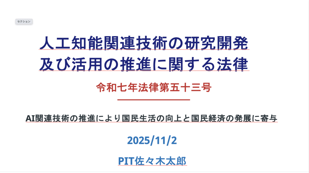 2025年11月定例会 定例会情報 X Facebook はてブ LINE コピー 2025.11.13 目次 教員資格(情報)を取得してみた株式会社SHIFTについてChatGPTだけでは難しいCursorで実現する『⾃分脳の構築』人工知能関連技術の研究開発及び活用の推進に関する法律AI時代の今、AIを作って戦っています 教員資格(情報)を取得してみた 株式会社SHIFTについて ChatGPTだけでは難しいCursorで実現する『⾃分脳の構築』 人工知能関連技術の研究開発及び活用の推進に関する法律 AI時代の今、AIを作って戦っています